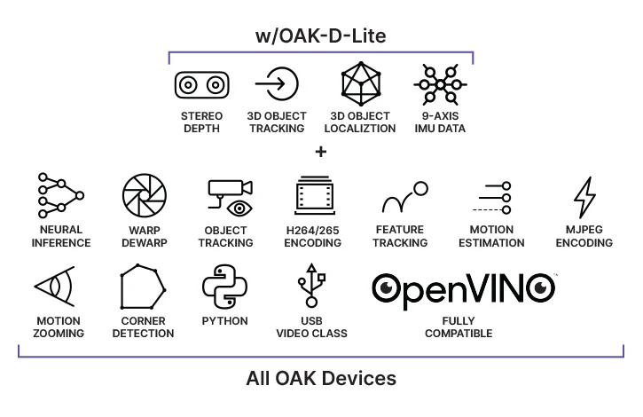 L’OAK-D Lite est la caméra ultime pour la vision robotique. Elle perçoit le monde comme un humain grâce à la combinaison d’ une caméra de profondeur stéréo et d’une caméra couleur haute résolution, le tout intégrant un réseau neuronal et des capacités de vision par ordinateur . Elle utilise un port USB-C pour l’alimentation et la connectivité USB 3.0.